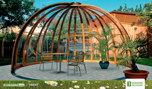 Весьма элегантная модель ORIENT с первого взгляда заинтересует своей воздушной легкостью. Безупречный купол создает атмосферу роскоши Востока, напоминая купола древневековых храмов и мечетей. Облегченная конструкция из узких сегментов позволяет свободно открывать павильон до самой вершины купола. Внутреннее пространство под павильоном можно полностью раскрыть навстречу теплым солнечным лучам или оградить легкой неприметной стеной, защищающей от непогоды и холода. Павильон отлично послужит как летним баром у бассейна, так и клубным VIP павильоном возле поля для гольфа, музыкальным салоном или небольшим уютным кафе. ТЕХНИЧЕСКИЕ ПАРАМЕТРЫ